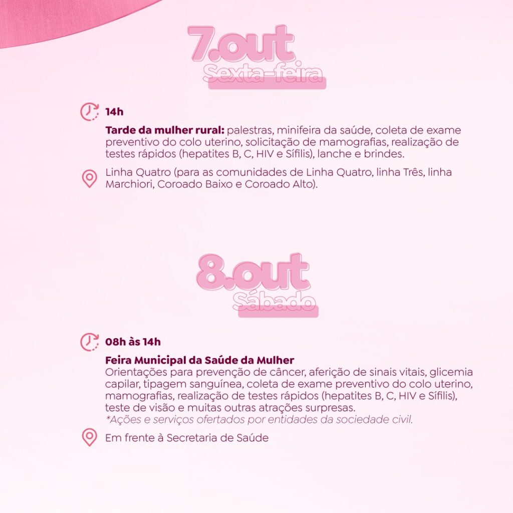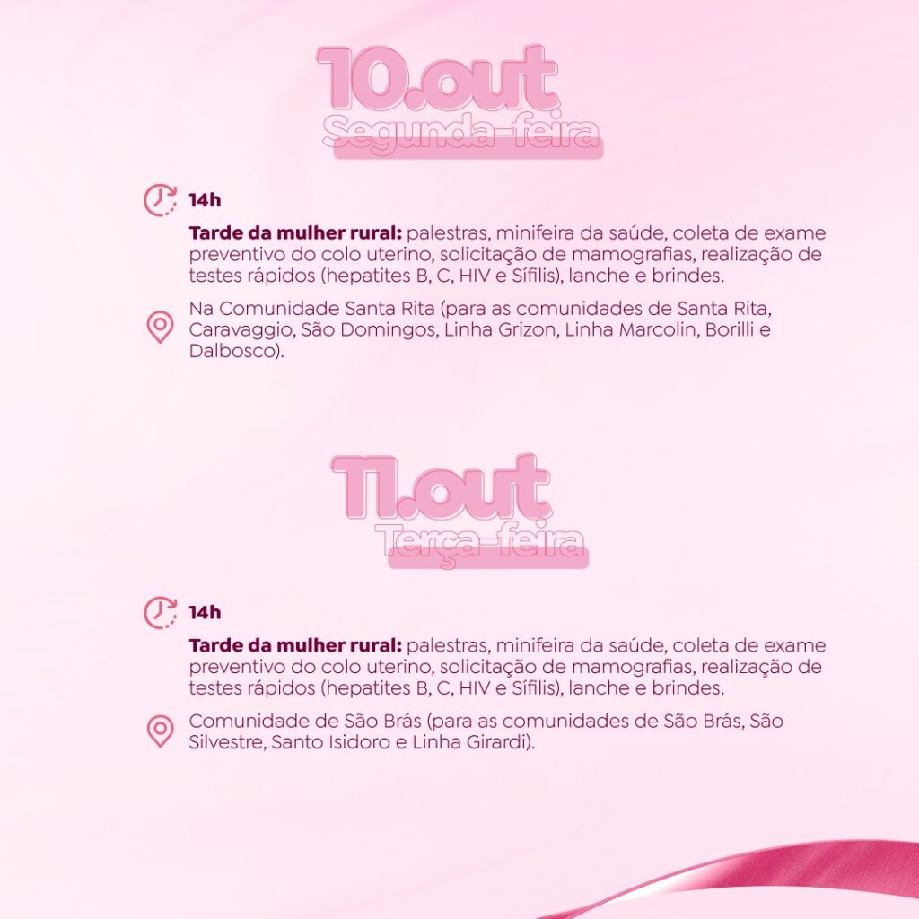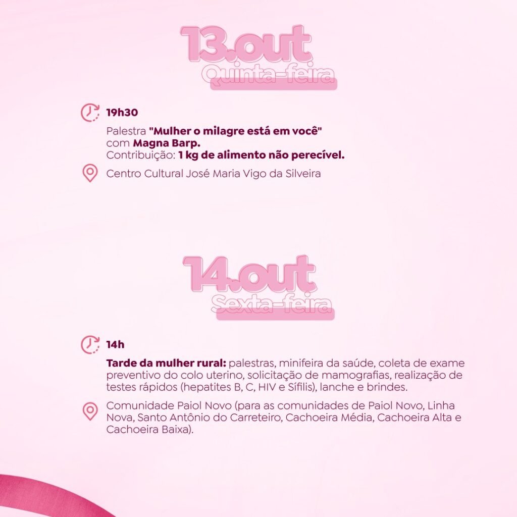 Os eventos alusivos ao Outubro Rosa, mês dedicado à prevenção e ao combate aos cânceres de Mama e de Colo de Útero, iniciam nesta quarta-feira (05), em Tapejara. A abertura da programação acontece no Centro Cultural José Maria Vigo da Silveira, a partir das 13h30. Nas imagens abaixo, confira mais detalhes sobre as ações preparadas para todo o mês. Participe!