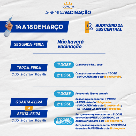 A vacinação acontecerá na UBS Central e é necessário levar Cartão SUS, documento com foto e menos de idade estarem acompanhados dos pais ou responsáveis.