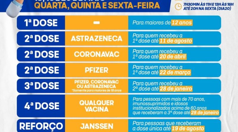 CONFIRA O CRONOGRAMA DE VACINAÇÃO CONTRA A COVID-19 ATÉ SEXTA-FEIRA (20)