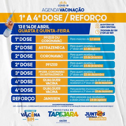 A Secretaria de Saúde de Tapejara promove nesta quarta-feira (13) e na quinta-feira (14) mais uma etapa de vacinação contra a Covid-19. Na oportunidade, serão aplicadas primeira, segunda e terceira doses ou dose de reforço e também a quarta dose, de acordo com cronograma da imagem.