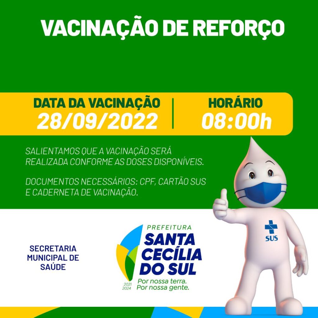 CONFIRA QUEM PODE REALIZAR MAIS UMA ETAPA DE VACINAÇÃO CONTRA O COVID-19 EM SANTA CECÍLIA DO SUL admin2 3 anos atrás Pessoas acima de 40 anos que realizaram a 3ª dose ou a 2ª dose a mais de 4 meses. Pessoas com 12 anos ou mais que fizeram a 2° a mais de 4 meses. Compartilhe isso:
