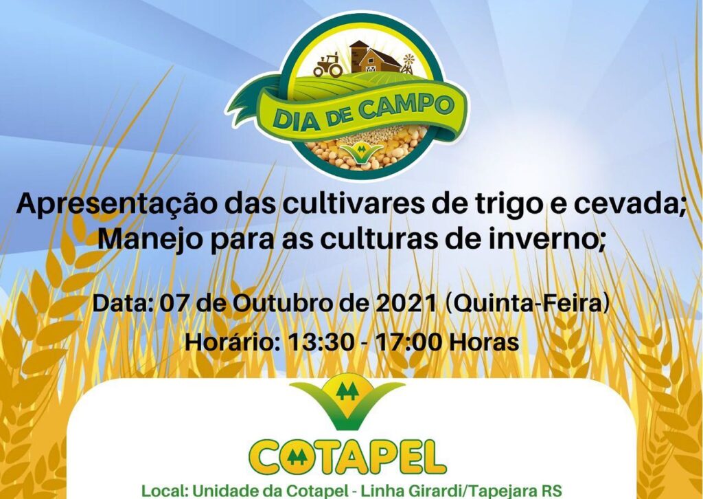 Participe e confica as novidades em cultivares de trigo e cevada, ferramentas de cobertura de solo, nutrição de plantas e manejo fitossanitário para as culturas de inverno. O Dia de Campo será dia 07 de outubro na Sede da Cotapel em Linha Girardi – Tapejara das 13:30 às 17:00 horas.