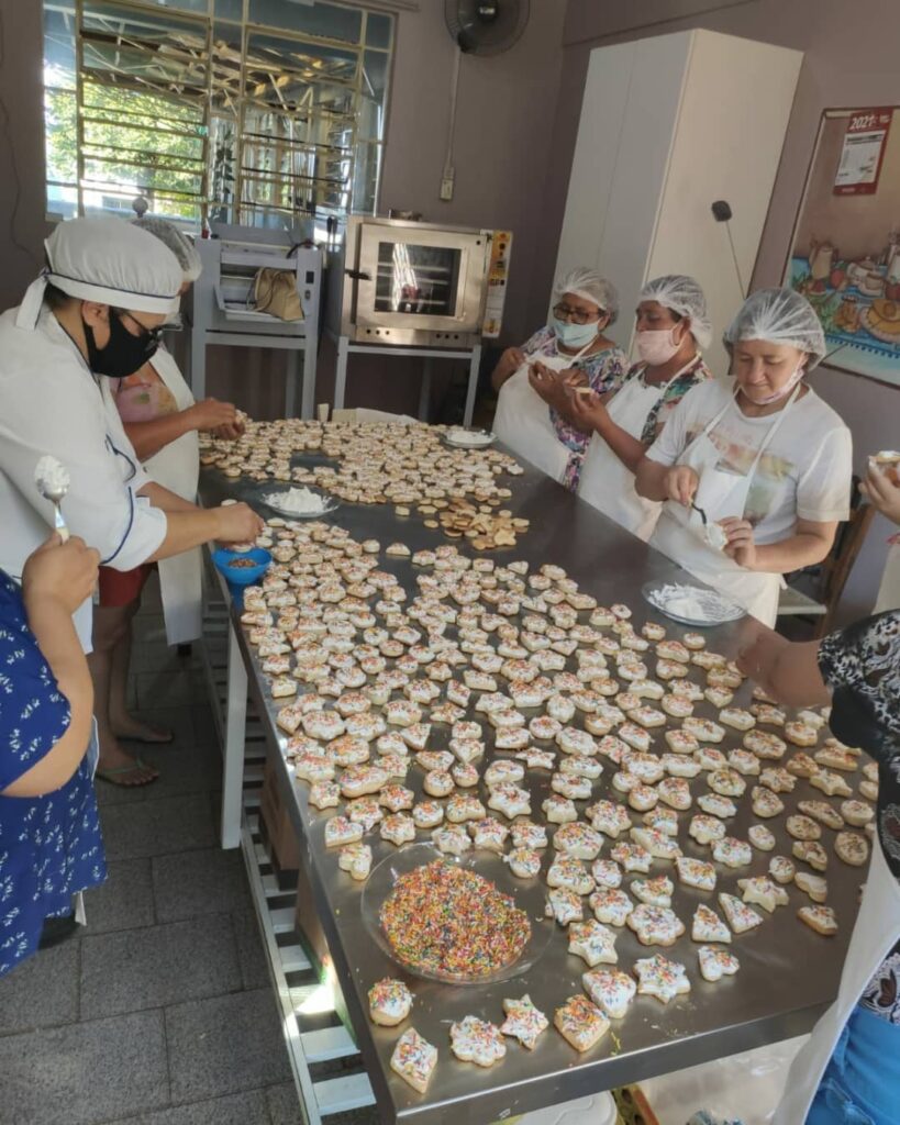 Mulheres que recebem Bolsa Família e integrantes dos grupos do Serviço de Convivência e Fortalecimento de Vínculos do CRAS participam de oficinas de confecção de bolachas, em Ibiaçá. O curso é desenvolvido desde julho pelo Centro de Referência em Assistência Social e acontece nas terças e quintas-feiras à tarde. As turmas são divididas em grupos de sete integrantes, conforme determinação do protocolo Covid-19. Ao todo, cerca de 40 mulheres participam das atividades. A foto retrata a última turma de 2021 confeccionando bolachas decoradas para o fim de ano. As atividades seguem no ano que vem, com turmas marcadas já para a próxima semana.