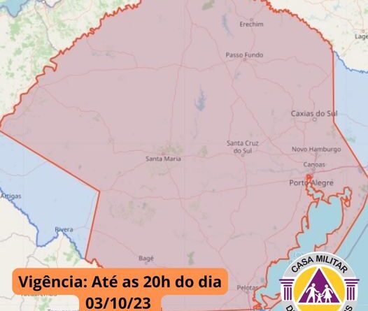 Com o avanço das instabilidades para outras regiões do Estado, a Defesa Civil do RS alerta para chuva pontualmente forte, descargas elétricas, eventual queda de granizo e vento forte. Válido até 20h desta terça-feira (03/10/23). Emergência ligue 190/193.