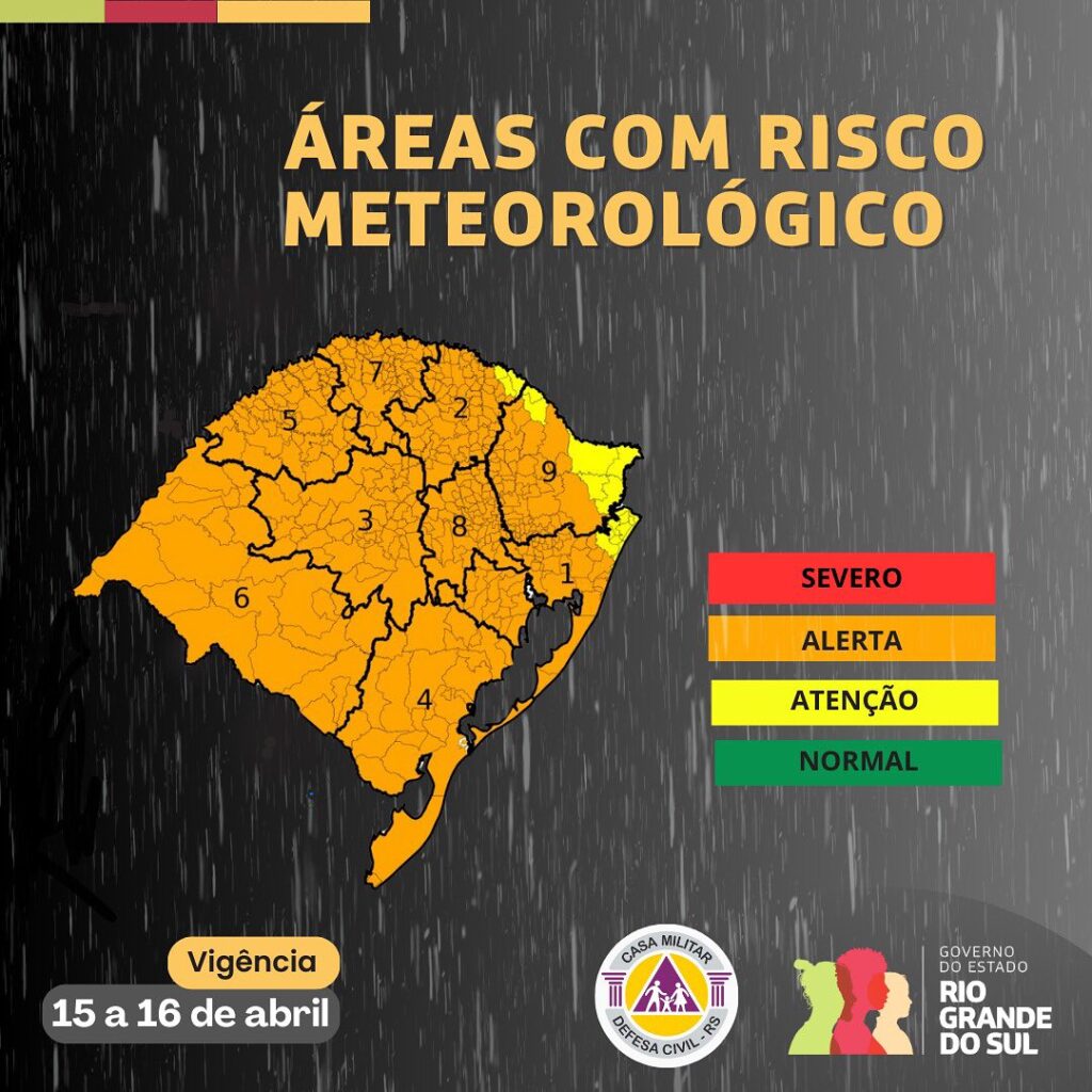 O monitoramento da Sala de Situação do Estado indica que na segunda-feira (15) a chuva forte e pontualmente intensa atua sobre o Oeste, Campanha, Sul, Centro, Missões e Noroeste. Há risco de queda de granizo na Campanha e Sul. Os acumulados variam entre 30 e 50 mm/dia, podendo passar isoladamente dos 90 mm/dia no Oeste, Campanha e Sul. No Sul e faixa Leste, os ventos sopram com velocidades em torno dos 40 aos 60 km/h, podendo passar dos 70 km/h e deixar o mar agitado.