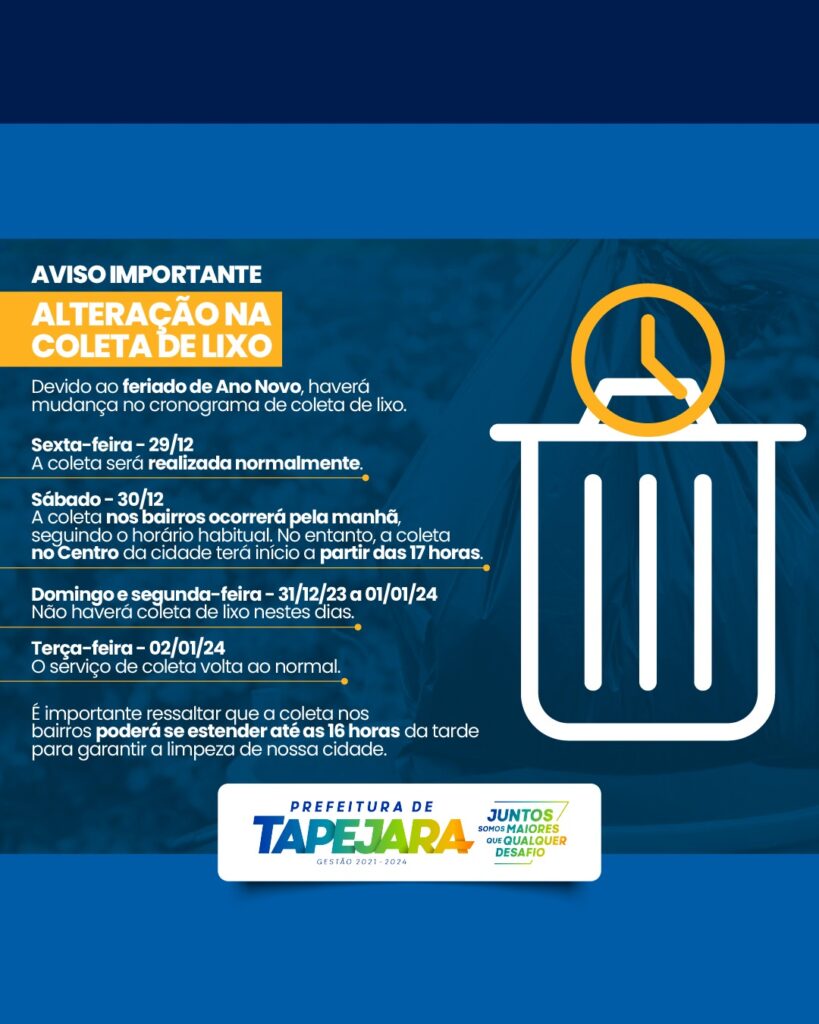 Domingo e segunda-feira (31/12/23 a 01/01/24): Não haverá coleta de lixo nestes dias.