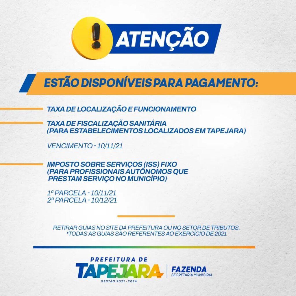 Estão disponíveis para pagamento a Taxa de Localização e Funcionamento e a Taxa de Fiscalização Sanitária referentes ao exercício de 2021. As taxas são devidas pelos estabelecimentos localizados no Município de Tapejara. O vencimento ocorre no dia 10/11/2021.
