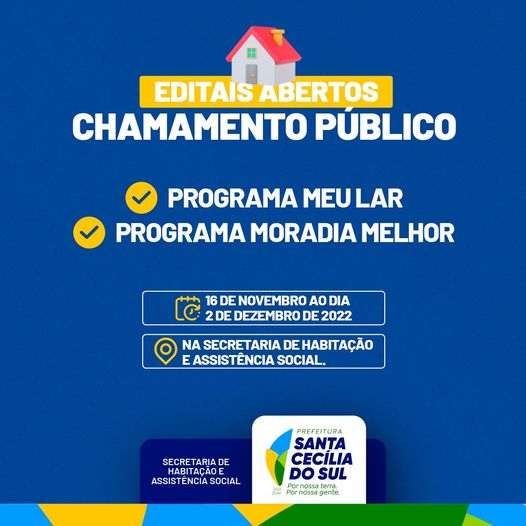 Foram abertos os Editais de Chamamento Público em Santa Cecília do Sul para o Programa Meu Lar e para o Programa Moradia Melhor. O prazo vai até 2 de dezembro na Secretaria da da Habitação e Assistência Social.