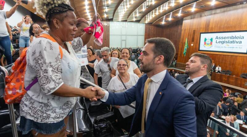 Após discursar no parlamento gaúcho, o governador Eduardo Leite fez questão de ir até as merendeiras de escolas estaduais que protestavam nas galerias da Assembleia Legislativa. O grupo de mulheres está com os salários atrasados por conta da falta de pagamentos da empresa terceirizada responsável.