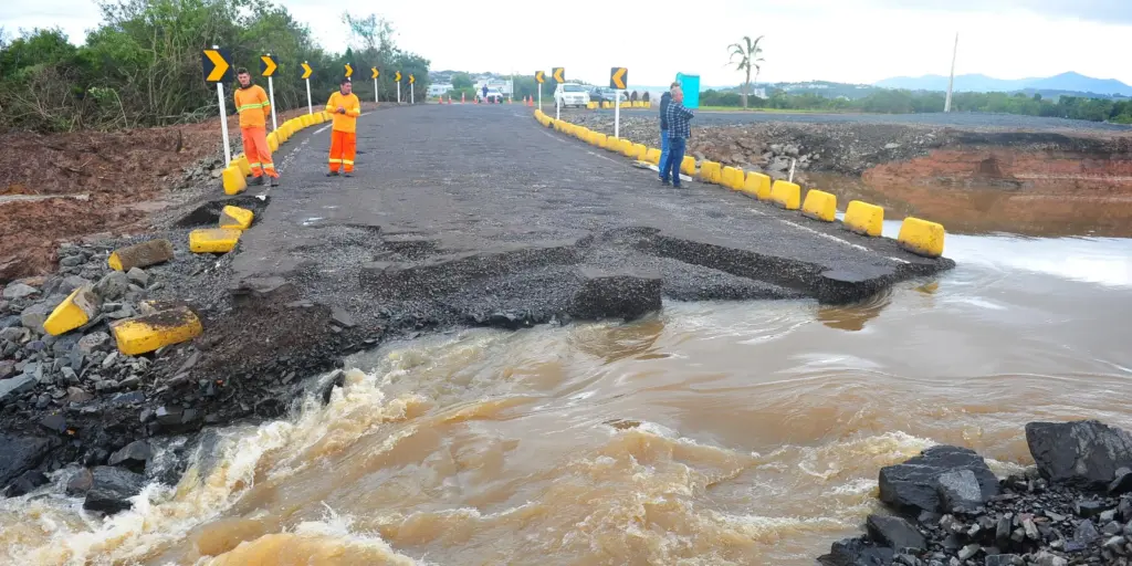 As equipes da Empresa Gaúcha de Rodovias (EGR) aguardam a água baixar para fazer o reparo e liberar novamente do trecho provisório na ERS 474, sobre Arroio Pereira, em Santo Antônio da Patrulha. Em virtude das fortes chuvas, o local encheu e a estrutura sofreu erosão em uma das bordas.