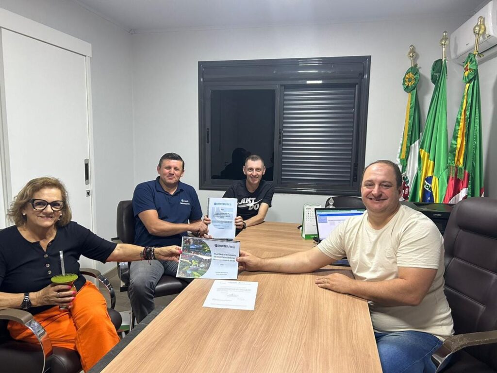 Sr. Sidnei, a extensionista Izar Teresinha da Fonseca Canal e o Secretário da Agricultura Vagner Luiz Cerezoli que apresentaram o Plano Operativo de Assistência Técnica e Extensão Rural E Social- ATERS 2024, e o Relatório de Assistência Técnica e Extensão Rural E Social- ATERS 2023.