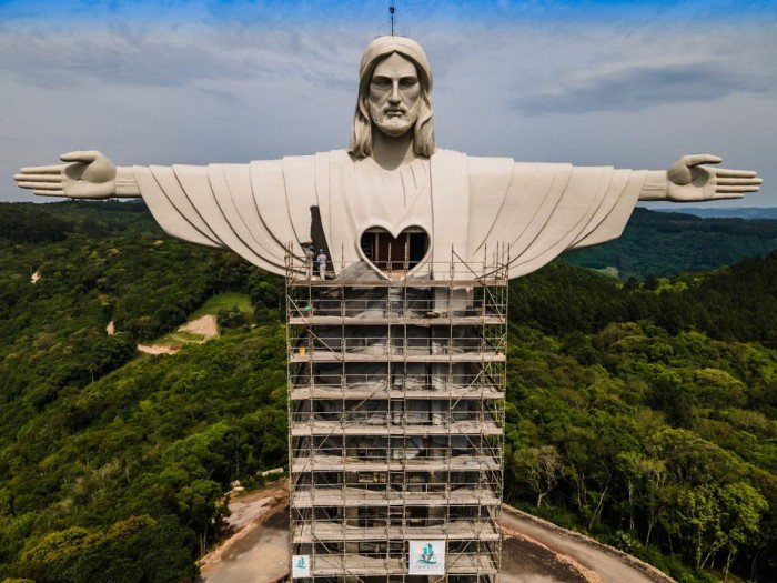A equipe responsável pela construção do Cristo Protetor removeu a estrutura de andaimes que ainda cobria parte do peito da estátua em Encantado, no Vale do Taquari (RS). Com isso, o coração do Cristo Protetor foi completamente revelado, levando a obra a dar um passo a mais em direção à conclusão.