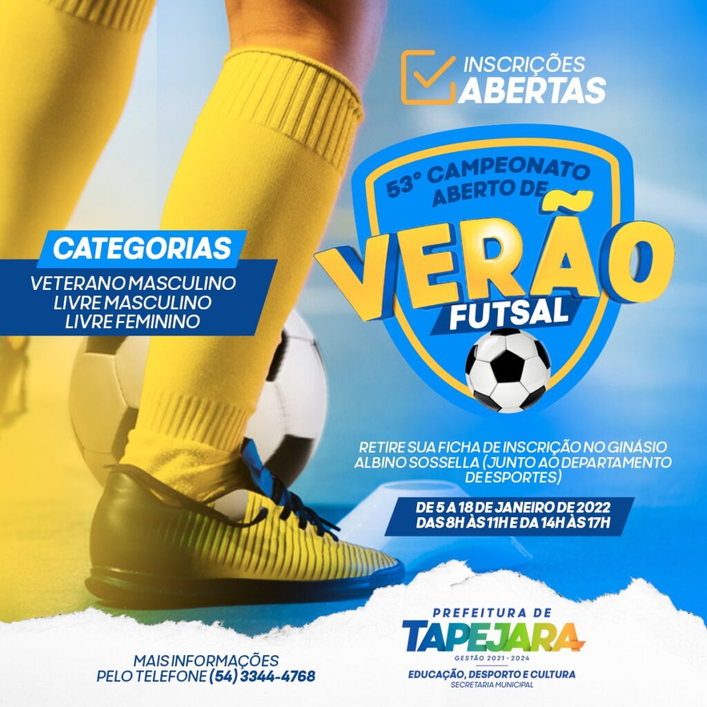 Seguem até hoje, dia 18 de janeiro as inscrições para o 53º Campeonato Aberto de Verão de Futsal em Tapejara. A competição, que deve iniciar no dia 1º de fevereiro, envolverá disputas nas seguintes categorias: