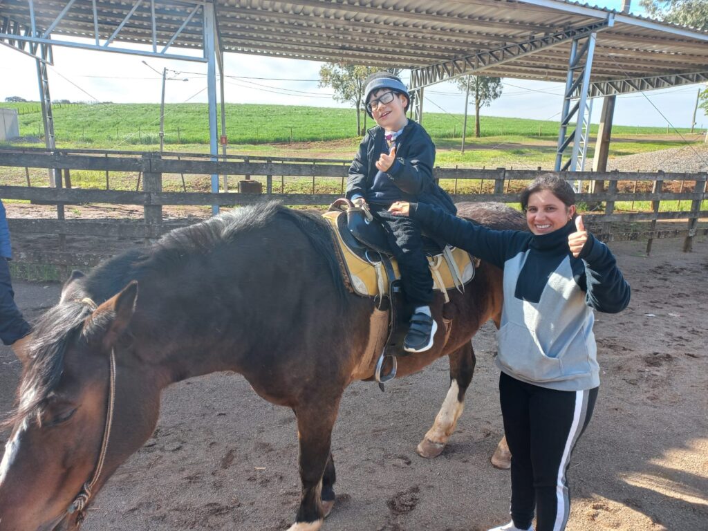 A equoterapia para os alunos do Grupo Vida e dos atendimentos especializados de Água Santa acontece toda segunda-feira no pavilhão em anexo ao Parque Municipal de Rodeios de Água Santa. Todas as aulas são especiais, mas essa da última segunda-feira foi pra lá de especial.
