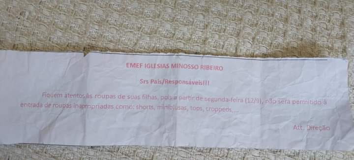 “Fiquem atentos às roupas de suas filhas, pois a partir de segunda-feira (12), não será permitida a entrada de roupas inapropriadas, como shorts, miniblusas, tops, croppeds… Att A direção”.