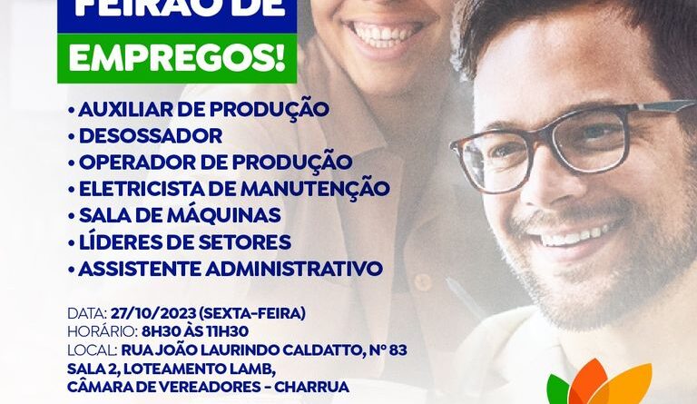 Empresa no ramo dos gêneros alimentícios de Estação – RS, estará realizando entrevistas de emprego na Câmara Municipal de Vereadores de Charrua no dia 27 de outubro, das 8h:30min às 11h:30min.