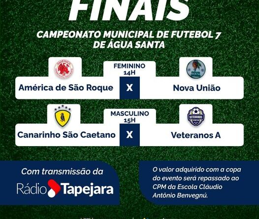 Será hojea grande final do Campeonato Municipal de Futebol 7 de Água Santa. Esperamos todos vocês amantes do esporte e do futebol para às 14h comparecerem ao Módulo Esportivo Américo Pedro Piton para prestigiarem os jogos da final entre os times VETERANOS A x CANARINHO DE SÃO CAETANO e AMÉRICA DE SÃO ROQUE x NOVA UNIÃO. Após os jogos haverá cerimônia de premiação aos times e atletas que se destacaram na competição.
