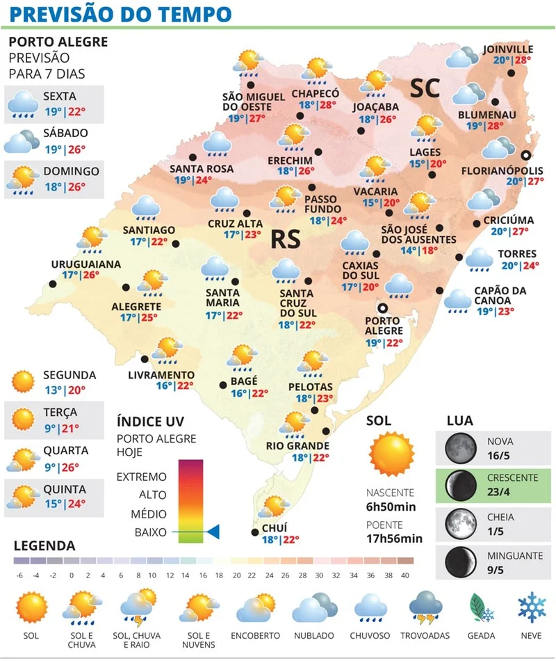A Grande Porto Alegre terá um dia chuvoso, com risco de chuva por vezes moderada a forte. Há ainda risco de temporais isolados no Norte do estado.