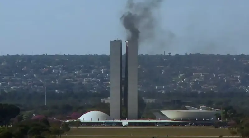 Uma grande quantidade de fumaça escura foi vista no Congresso Nacional, em Brasília, nesta sexta-feira (21). Em imagens gravadas é possível ver a fumaça na torre que fica localizada mais próxima da Câmara dos Deputados