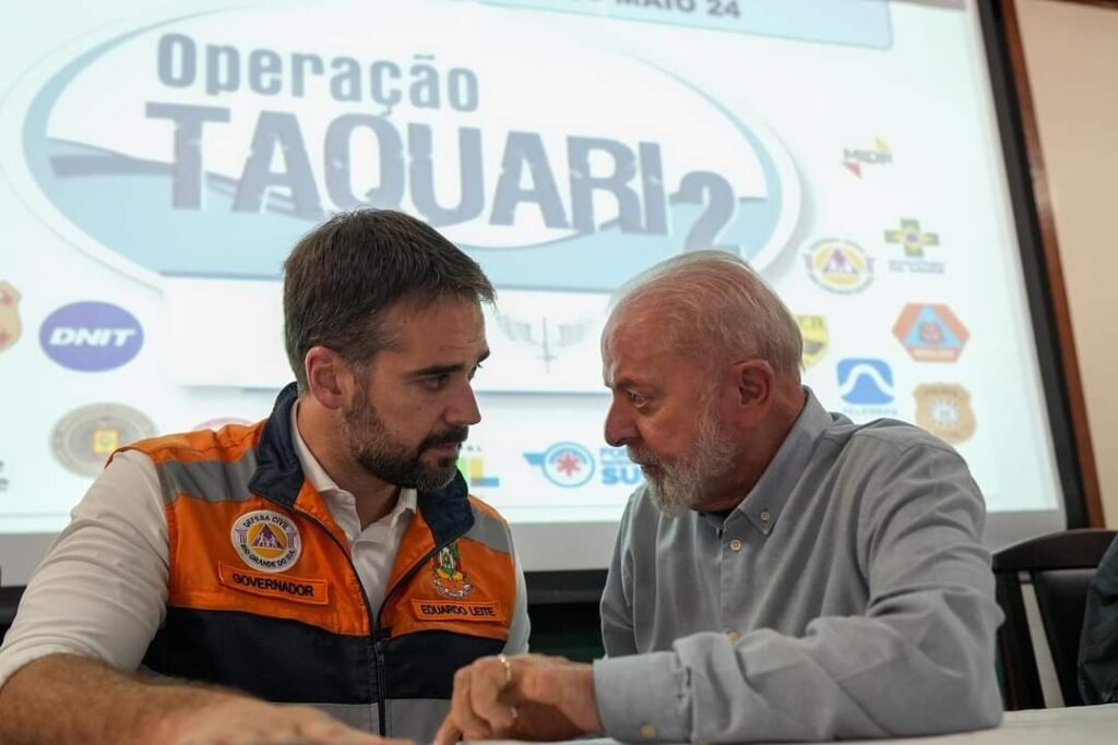 O governador Eduardo Leite está reunido com o presidente Lula para alinhar as principais ações de busca e salvamento e as medidas que serão adotadas para fornecer ajuda humanitária às populações mais atingidas pelas enchentes. Também estão no Rio Grande do Sul o presidente do Senado, Rodrigo Pacheco, o presidente da Câmara dos Deputados, Arthur Lira, e ministros do Governo Federal. Na coletiva de imprensa, Leite agradeceu a todo o apoio do governo federal e das forças nacionais de segurança e reafirmou que o momento é de união e foco em salvar vidas.