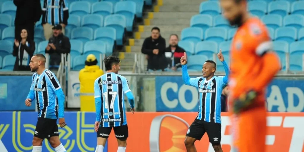 Até boa parte do primeiro tempo, o Grêmio teve dificuldade de finalizar em boas condições. Mas, no fim do primeiro tempo, voltou a ameaçar e melhorou. Aos 43, Guilherme recebeu, girou com categoria e bateu forte. Vanderlei defendeu e, no rebote, Biel bateu por cima. A chegada foi um prenúncio do gol, dois minutos depois. A bola sobrou na esquerda para Campaz e ele finalizou com força, no canto, sem chances para Vanderlei, abrindo o placar e levando o Grêmio com vantagem de 1 a 0 ao intervalo.