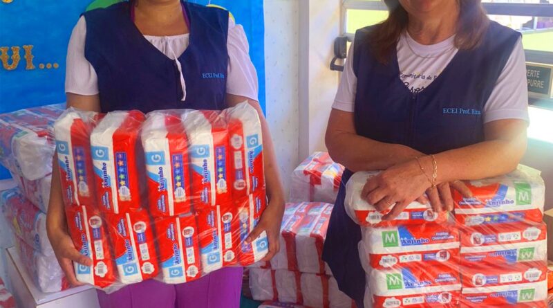 As doações foram feitas em produtos a pedido das próprias escolas. Lenços umedecidos e fraldas infantis são necessidades neste momento de recuperação.