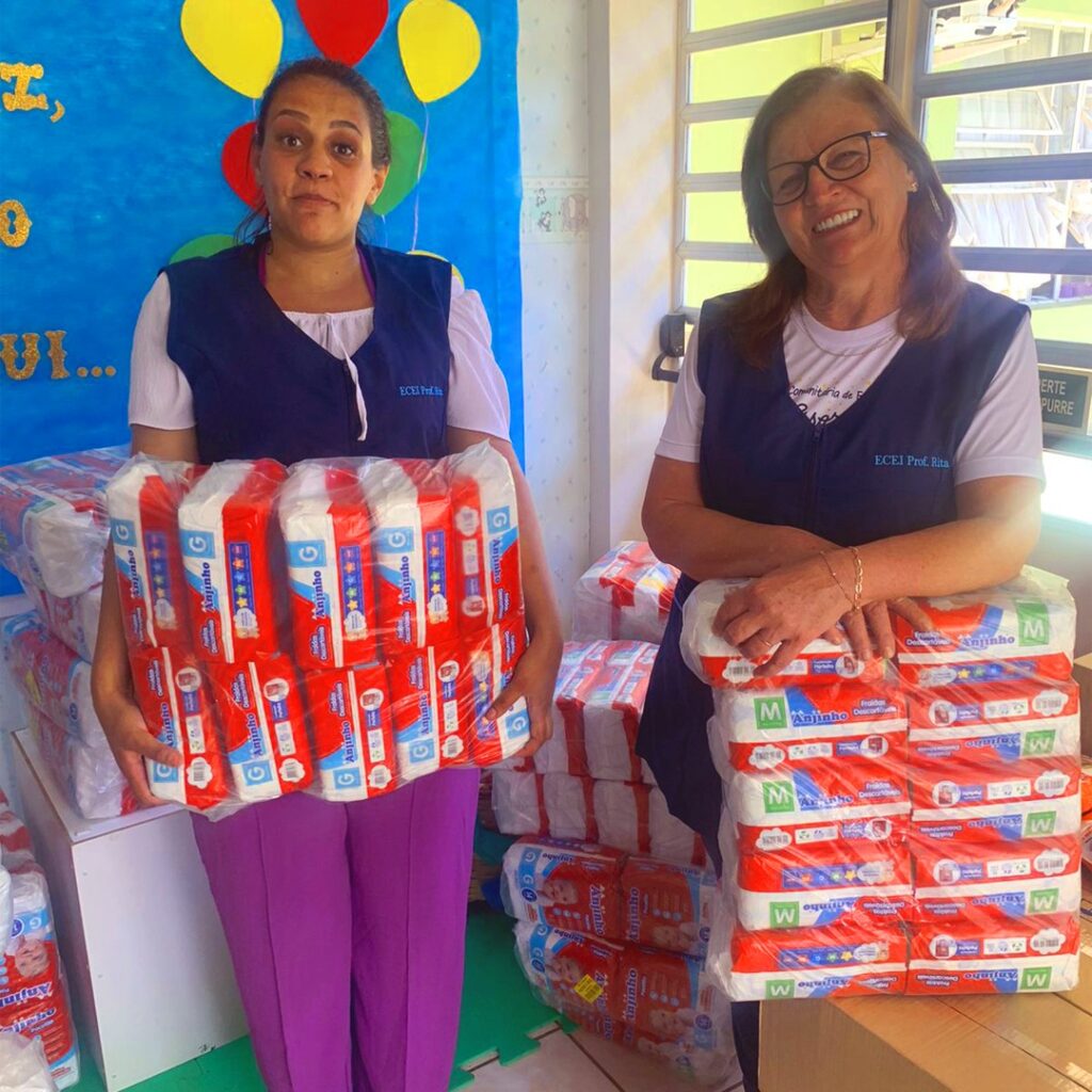 As doações foram feitas em produtos a pedido das próprias escolas. Lenços umedecidos e fraldas infantis são necessidades neste momento de recuperação.