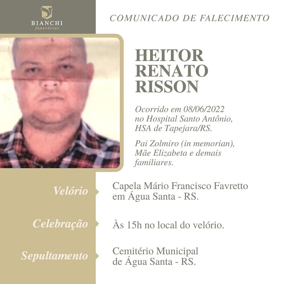 A Bianchi Funerárias, juntamente com a família Risson, comunica com pesar, o falecimento de HEITOR RENATO RISSON, com 35 anos de idade, ocorrido quarta-feira (08/06/2022), no Hospital Santo Antônio – HSA, em Tapejara-RS. Seu corpo está sendo velado na Capela Mário Francisco Favretto de Água Santa. Às 15:00 horas de quinta-feira (09/06/2022) haverá celebração e após seu sepultamento no Cemitério Municipal de Água Santa.
