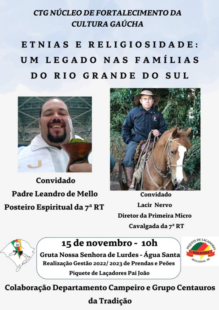 A gestão 2022/2023 de Prendas e Peões da Invernada Artística e Cultural Pai João de Água Santa convida toda a comunidade água-santense para no dia 15 de novembro, participar, na Gruta Nossa Senhora de Lurdes, da celebração gaúcha, assim como do resgate das etnias na religiosidade das famílias e demais atividades.