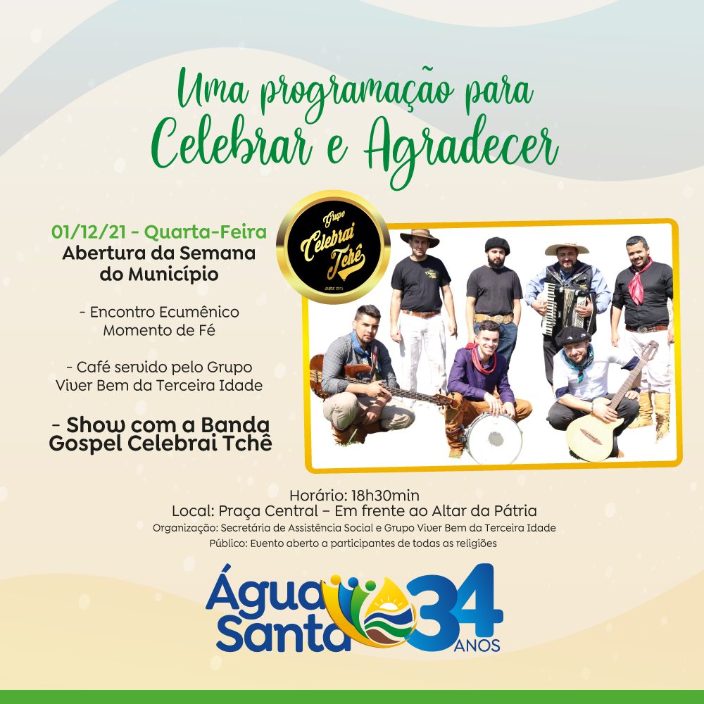 Para darmos início às comemorações hoje, 01 de dezembro, às 18h30min, na Praça Central Avelino Júlio Pimentel acontecerá a abertura da SEMANA DO MUNICÍPIO com um momento ecumênico aonde todas as igrejas do município irão se reunir para um momento de fé. Logo após haverá show com a banda gospel Celebrai Tchê. Durante o evento será servido um café pelo Grupo Viver Bem da Terceira Idade de Água Santa.