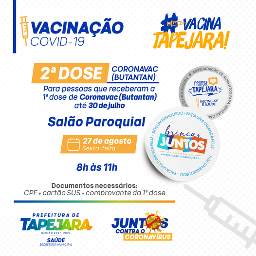 A Secretaria de Saúde de Tapejara promove nesta sexta-feira, 27/08, a vacinação da segunda dose contra a Covid-19 para pessoas que receberam a primeira dose de CoronaVac até o dia 30 de julho. A etapa acontece no Salão Paroquial das 8h às 11h.