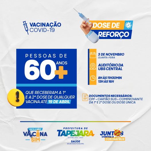 A Secretaria de Saúde de Tapejara promove nesta quinta-feira, 04/11, a vacinação da dose de reforço contra a Covid-19 para pessoas com 60 anos ou mais e que receberam a segunda dose de qualquer imunizante até 24 de abril.