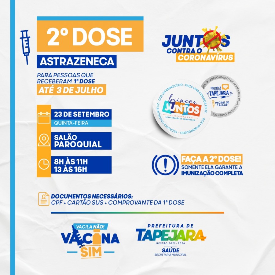 A Secretaria de Saúde de Tapejara promove hoje, quinta-feira, 23/09, a vacinação da segunda dose contra a Covid-19 para pessoas que receberam a primeira dose de AstraZeneca (Fiocruz) até o dia 03 de julho. A etapa acontece no Salão Paroquial das 08h às 11h e das 13h às 16h.