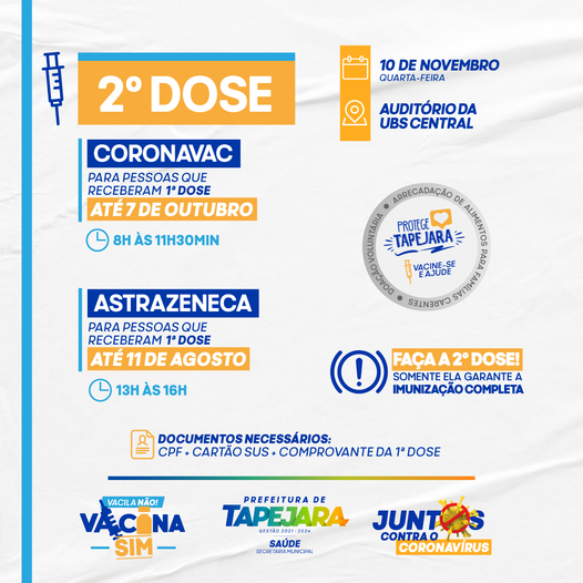 A Secretaria de Saúde de Tapejara promove nesta quarta-feira, 10/11 vacinação da segunda dose contra a Covid-19 CoronaVac (Butantan) e AstraZeneca (Fiocruz). A etapa acontecerá no Auditório da UBS Central: