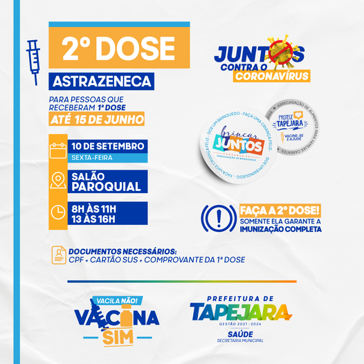 A Secretaria de Saúde de Tapejara promove nesta sexta-feira, 10/09, a vacinação da segunda dose contra a Covid-19 para pessoas que receberam a primeira dose de AstraZeneca até o dia 15 de junho.