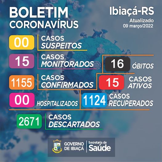 O levantamento desta quarta-feira (09.03) apresenta 15 casos ativos de coronavírus em nosso município. Ao todo, são 1155 casos confirmados, destes, 1124 já recuperados e 16 evoluíram a óbito. .
