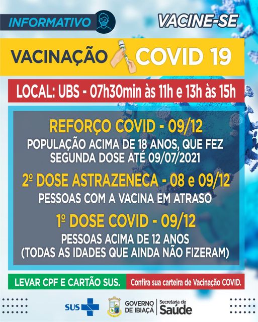 Nesta quinta-feira, acontecerá vacinação em primeira dose, segunda dose e reforço. Confira na tabela as datas e horários.