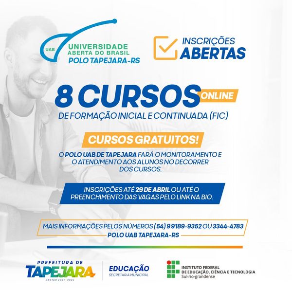 O Instituto Federal de Educação, Ciência e Tecnologia Sul-rio-grandense (IFSul), em parceria com o Polo UAB de Tapejara, abriu as inscrições para 8 cursos de Formação Inicial e Continuada (FIC).