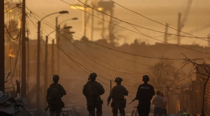 Em Lirquén, soldados patrulhavam as ruas ao cair da noite.