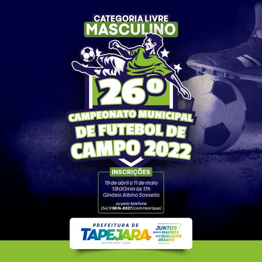 Inicia nesta terça-feira (19), as inscrições para o 26º Campeonato Municipal de Futebol de Campo 2022. A data para início da competição, que terá disputas na categoria Livre Masculino, será divulgada nos próximos dias.