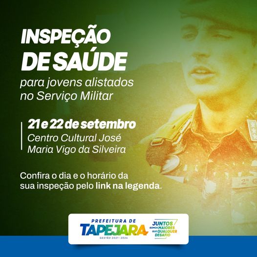 Foi divulgada pela Junta de Serviço Militar de Tapejara a lista dos jovens que deverão comparecer à Inspeção de Saúde nos dias 21 e 22 de setembro. A avaliação será realizada no Centro Cultural José Maria Vigo da Silveira por integrantes do Exército de Alegrete.