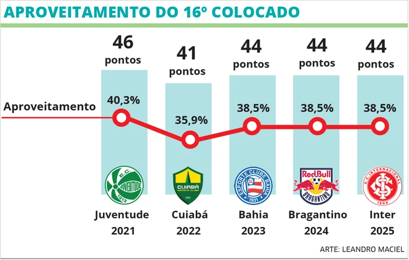 Mais do que a posição na tabela, o que acende o sinal de alerta no Beira-Rio é o desempenho ao longo da competição. Apesar de ter perdido apenas um dos seus últimos sete jogos, o aproveitamento de 35% é considerado baixo para quem pretende se manter na elite. Nos últimos cinco anos (ver quadro abaixo), o 16º colocado sempre encerrou o campeonato com índice superior a esse, o que reforça o risco caso o atual ritmo seja mantido até o fim do ano.