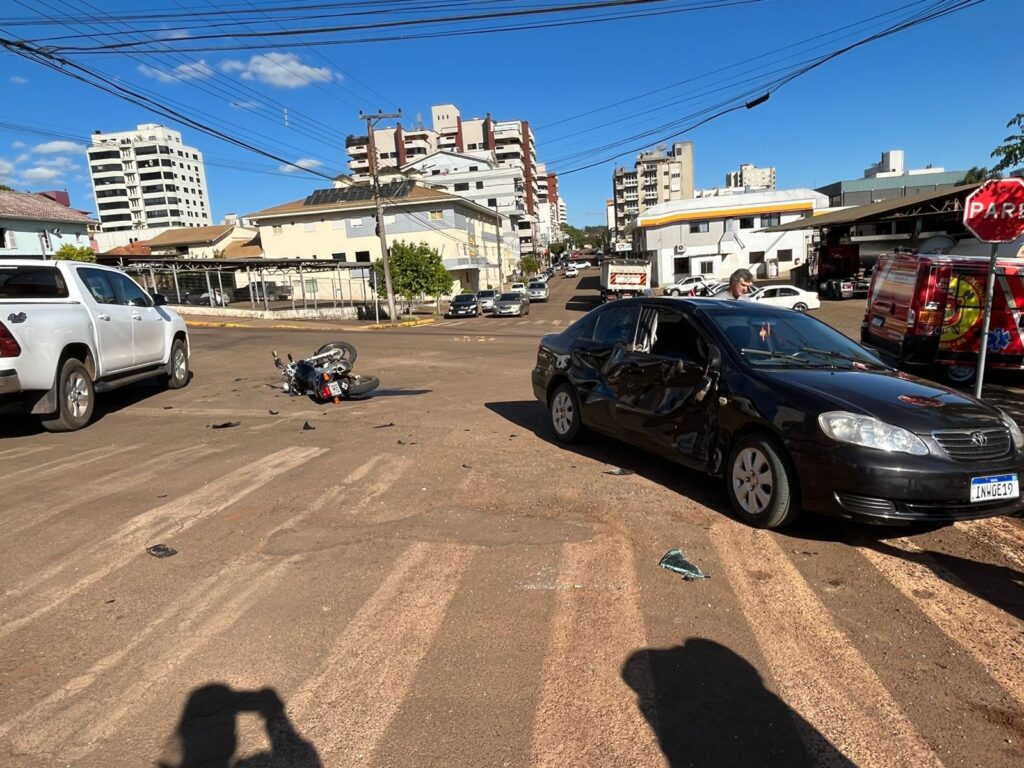 Envolveram-se no acidente um automóvel Toyota Corolla, de cor preta, que transitava pela Rua XV de novembro, sentido centro – saída para Santa Rita, e uma motocicleta Honda, de cor preta, que transitava pela Rua Julho de Castilhos, sentido centro – Bairro São Cristóvão.