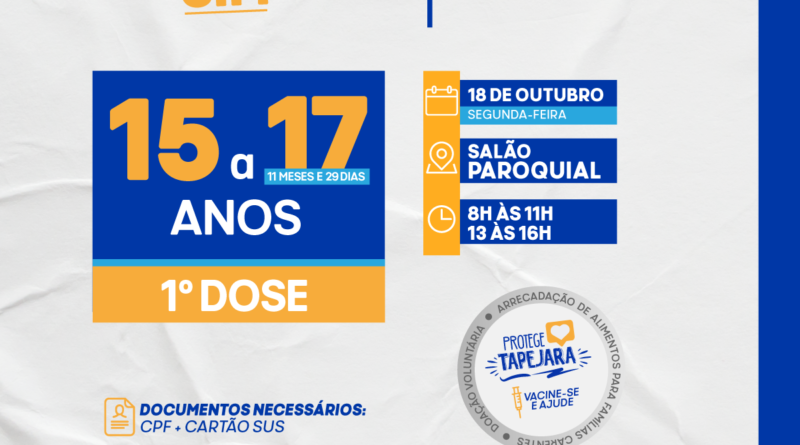 A Secretaria de Saúde de Tapejara promove nesta segunda-feira, 18/10, a vacinação contra a Covid-19 dose 1 para adolescentes de 15 anos a 17 anos, 11 meses e 29 dias.