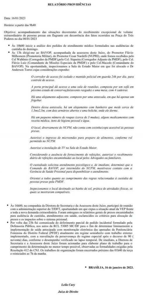 Leila autorizou ainda a entrada de refeições preparadas para Torres todos os dias. “Considerando a ausência de fornecimento de refeições, autorizei o recebimento diário de refeições encaminhadas ao local pelos advogados ou familiares”, afirma no relatório.