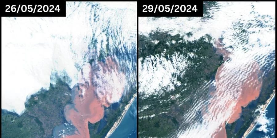 Nos últimos dias, as partículas de terra, argila, areia, esgoto e resíduos chegaram à região Sul do RS. Desde o início da semana, imagens captadas pelo satélite Sentinel-3 e analisadas pelo Laboratório de Oceanografia Dinâmica e por Satélites (LODS), da Universidade Federal do Rio Grande (FURG), aponta que a mancha de sedimentos que se deslocou do Guaíba para a Lagoa dos Patos já está escoando pelo canal dos Molhes da Barra.