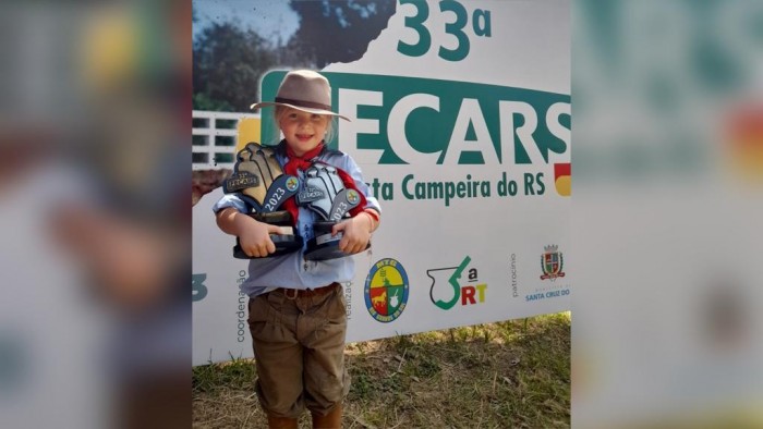 Sophia Pietra Panisson Marcon, seis anos, de Santa Cecília do Sul, vai participar do 20º Rodeio Crioulo Nacional de Campeões, em Irati-PR, de 20 a 23 de julho de 2023. Ela disputará o laço bonequinha, modalidade que já acumula mais de 50 troféus. Sophia, tem exatos 54 troféus conquistados em competições municipais e regionais no Rio Grande do Sul.