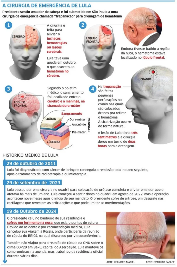 O petista está internado em São Paulo. Ele sentiu dores de cabeça na segunda-feira, 9, e foi até a unidade de Brasília do Sírio Libanês para fazer exames. O sangramento foi constatado, e Lula foi transferido de avião para a unidade de São Paulo, mais equipada, do mesmo hospital. A operação foi na madrugada de segunda para terça-feira, 9 e 10. A expectativa é que ele volte para Brasília na próxima semana.
