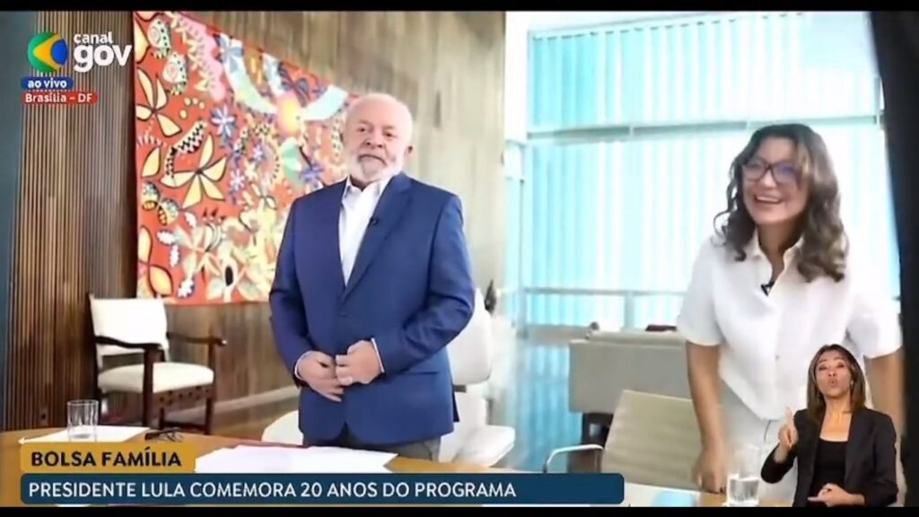 O presidente da República falou ao lado da primeira dama, Janja. Ao fim do pronunciamento, se levantou para mostrar recuperação da cirurgia – o enquadramento da câmera era aberto o suficiente para mostrá-lo de pé.