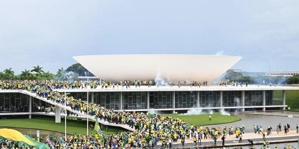 Manifestantes furaram o bloqueio feito pela Polícia Militar do Distrito Federal na tarde deste domingo (8) e invadiram a parte superior do Congresso Nacional, em Brasília. Os atos são organizados por eleitores que não aceitam a vitória de Luiz Inácio Lula da Silva (PT) nas urnas em 2022.PauseUnmute